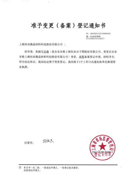因公司业务发展需要, 经工商部门批准,从2021年9月8日起,我公司名称由原先的“上海恒业分子筛股份有限公司”变更为“上海恒业微晶材料科技股份有限公司”。